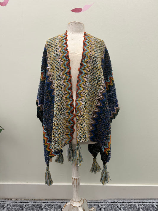 Colorful Crochet Patterned Ruana Poncho with Tassels