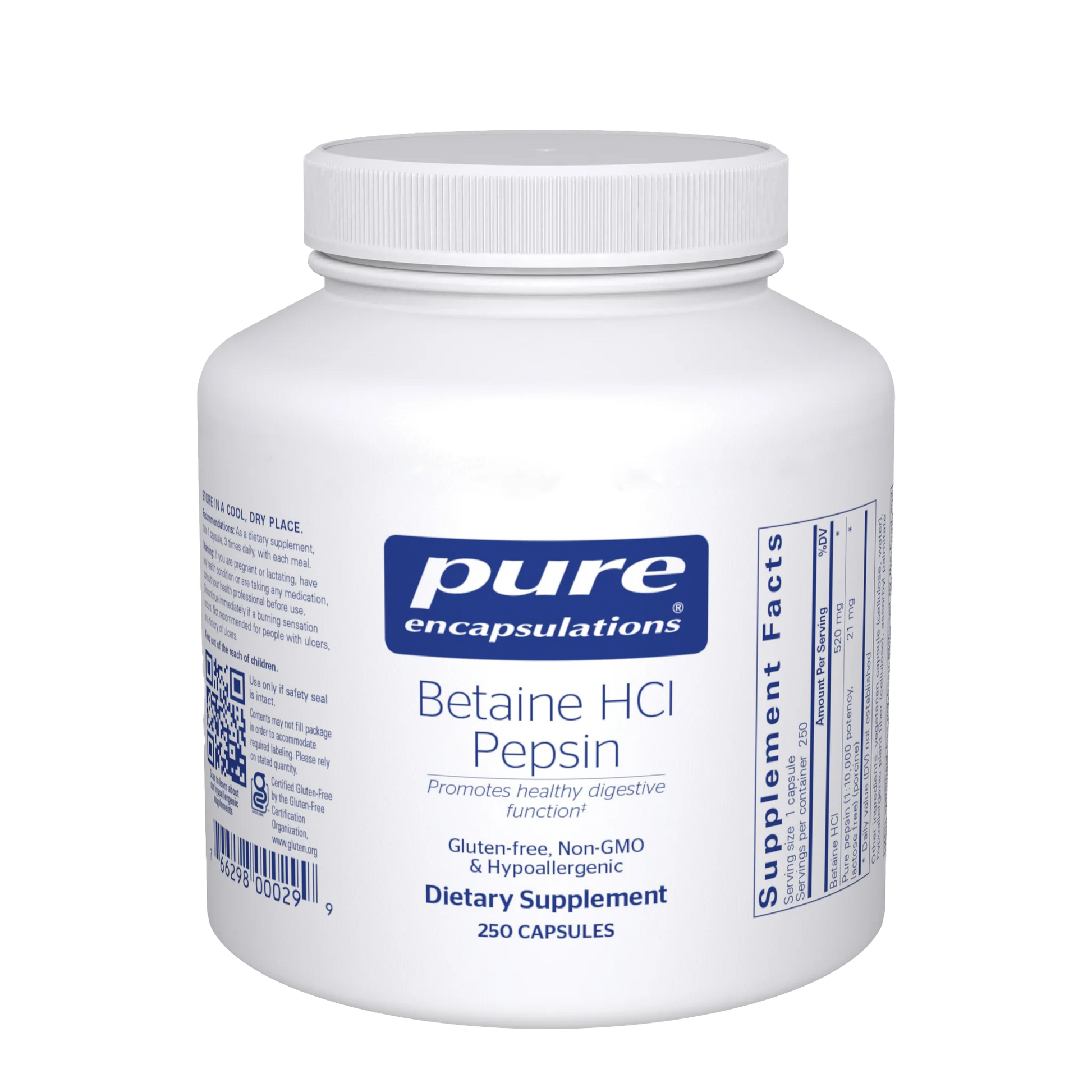 Betain HCl Pepsin promotes healthy digestive function. Betain HCl Pepsin may help stimulate digestive function and absorb nutrients; specifically protein, calcium, vitamin B12 and iron.*