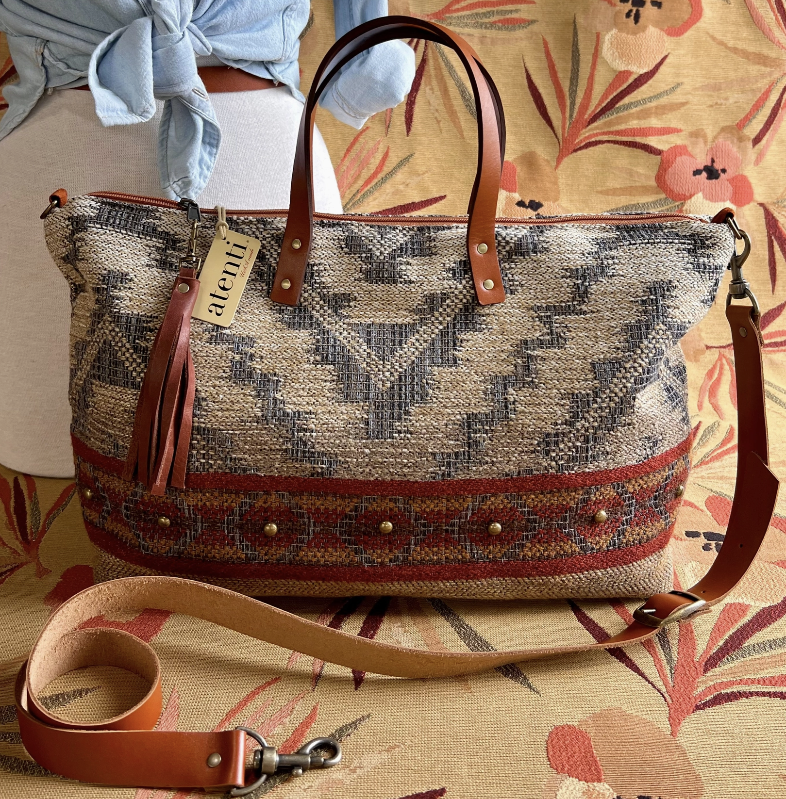 Pack your essentials in Southwest style with the Chapparal Buddy Bag. Crafted from stylishly woven jacquard fabric, this bag is perfect for traveling adventurers looking to make a statement. With plenty of room for your supplies, you're ready to take on the wild unknown! This chic sack will be your new BFF! Get a grip on its leather handles, and you can easily adjust the detachable crossbody strap to your comfy fit. It boasts a water-repellent taffeta lining, a nifty zippered pocket, and a split open pocket with the perfect space for your cell phone. On top of that, it has metal feet and a zippered closure.