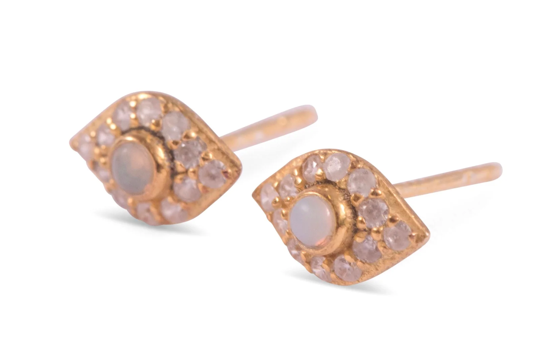 These Gold Evil Eye Studs with Opal Earrings feature a protective evil eye design accented by shimmering opals, symbolizing good luck and warding off negativity. Set in gleaming gold, they offer a delicate yet meaningful touch to any jewelry collection.