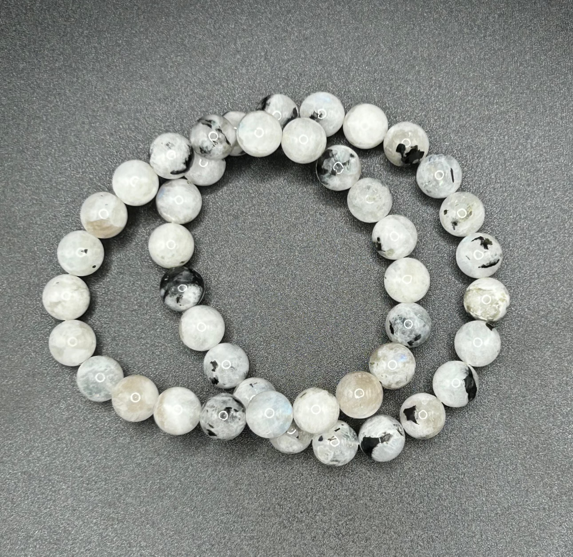 These moonstone bracelets have an elastic band inside a white to tan to black bead that is approximately 6mm in size and 5.5"-6.5" around.