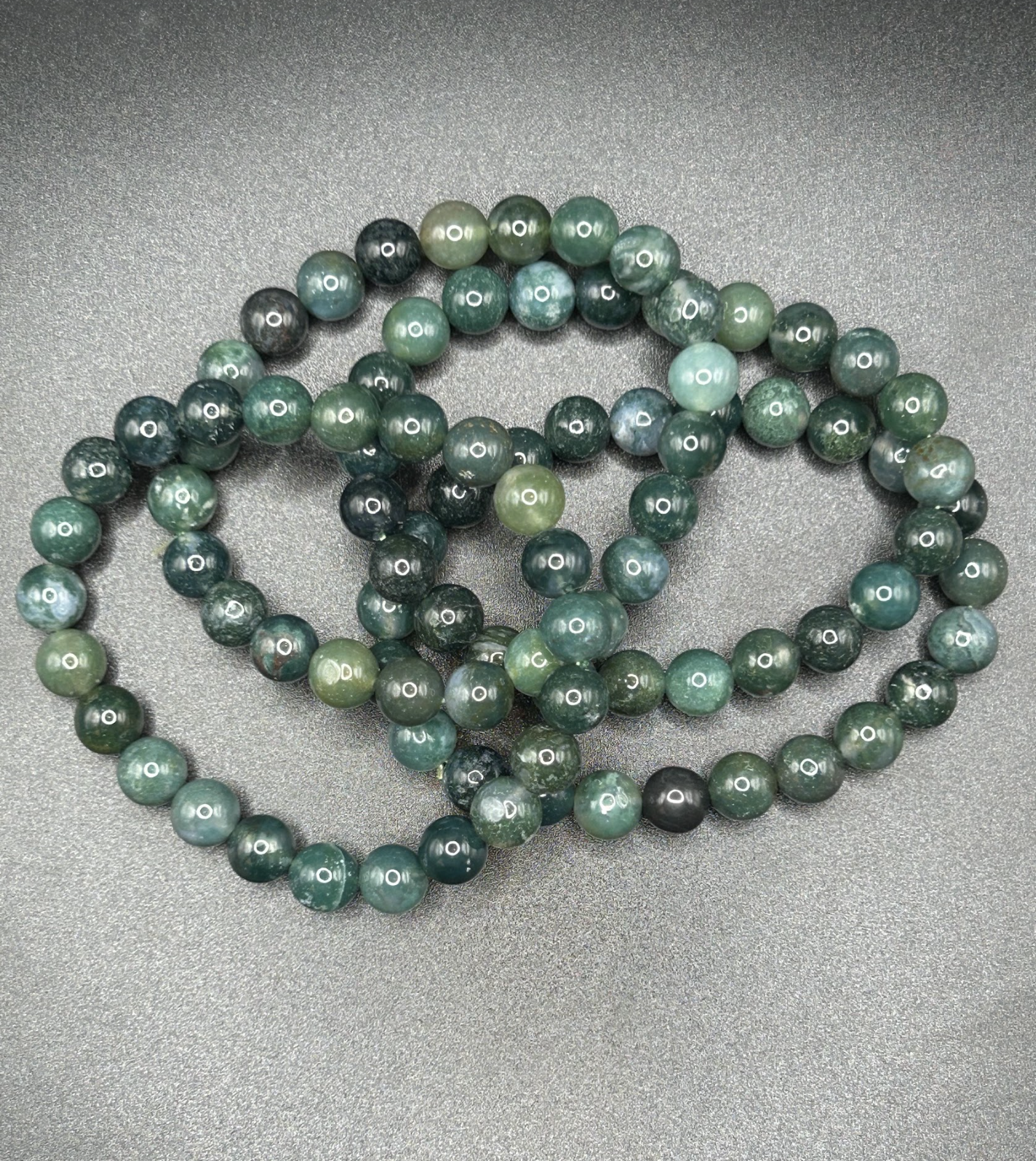 These moss agate bracelets have an elastic band inside a light to dark green bead that is approximately 6mm in size and 5.5"-6.5" around.