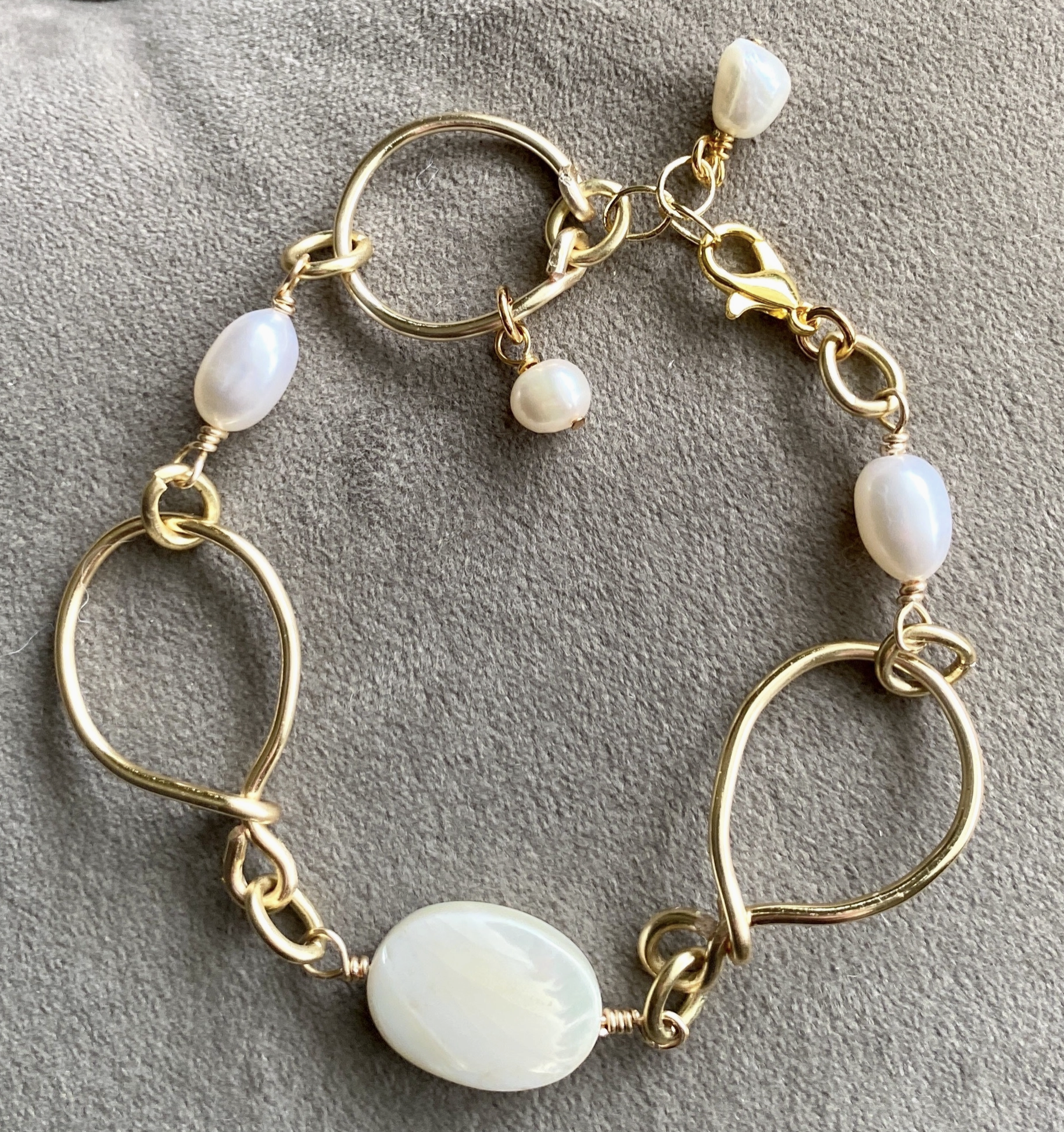 Classic gold with pearls and mother of pearl shells. Using gold plated, tarnish resistant wire to form eternity connectors and adding these beautiful AAA grade freshwater pearls and 18mm x 13mm mother of pearl shells. Wire wrapped for security and style to give each piece that clean finished look. Gold plated lobster clasp and extender chain to fit sizes 7"-8.5".