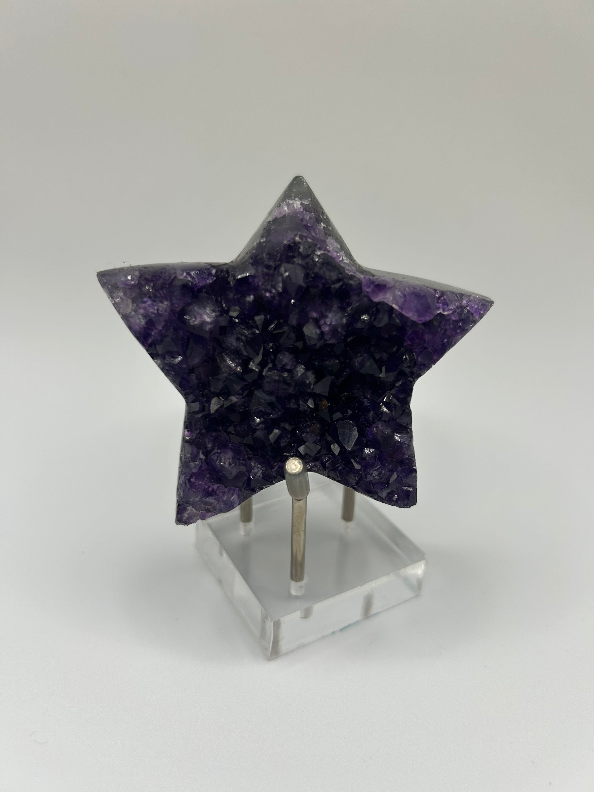 Amethyst, a variety of quartz distinguished by its striking purple hue, has been valued for centuries in crystal healing traditions. This star-shaped specimen showcases the stone's natural violet coloration and geometric form. Amethyst is traditionally associated with calming energy and mental clarity. Its compact size makes it ideal for personal collections, meditation spaces, or as a decorative accent. Each stone is a natural formation with unique variations in color intensity and pattern.