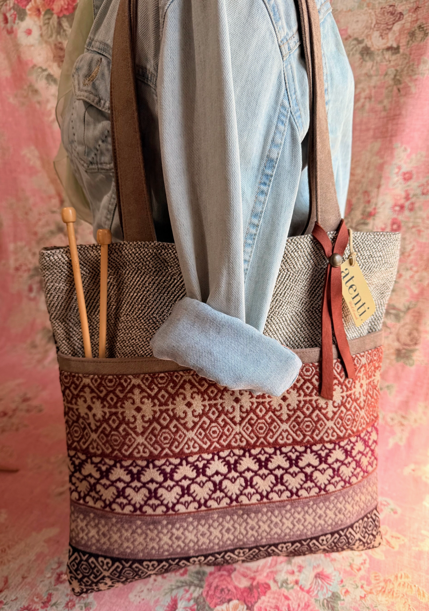 The Atenti Market Bags have a soft tote style design with handles. Each one features a unique combination of fabrics and patterns. These bags are ideal for carrying groceries, books, or everyday items.
